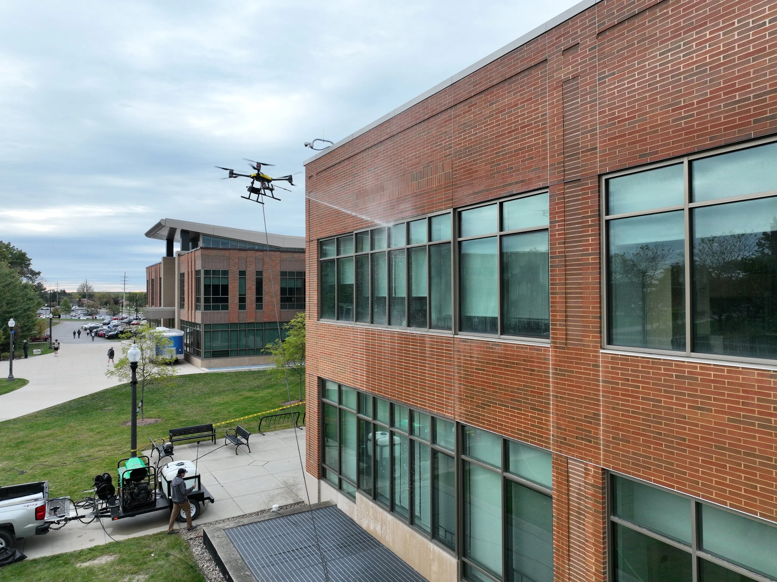Drone-based exterior cleaning for tanks, buildings, and structures without lifts, scaffolding, or shutdown.