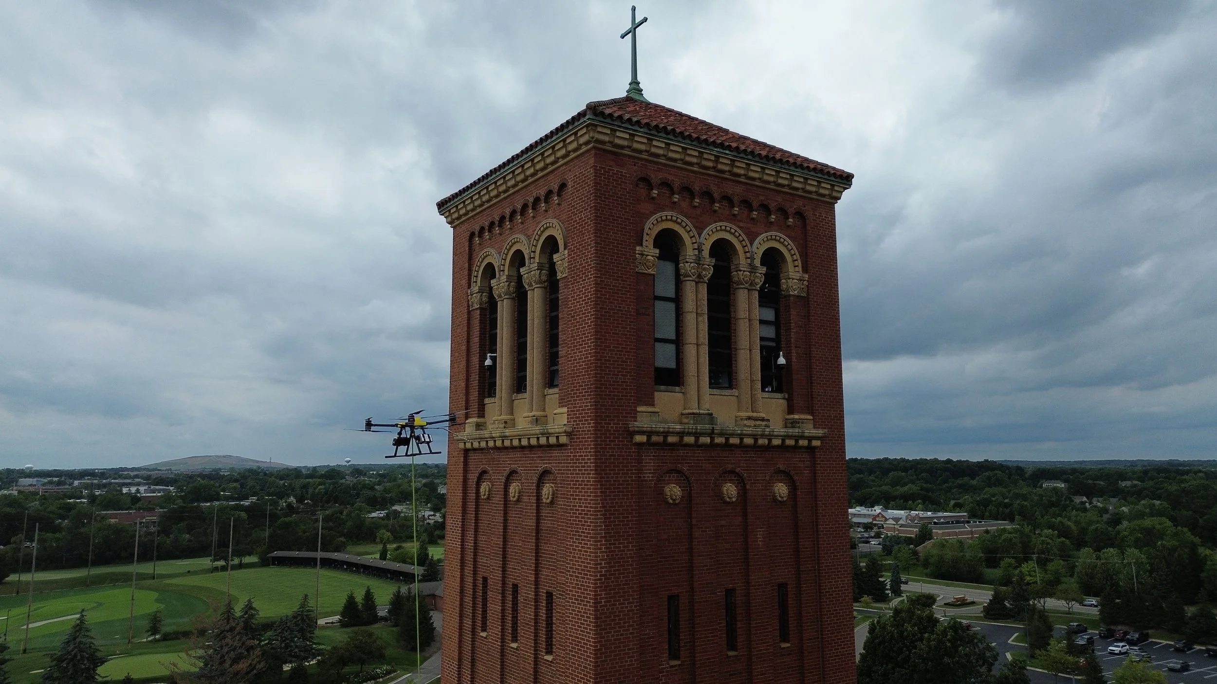 Cleaning the iconic 155 foot bell tower by drone.